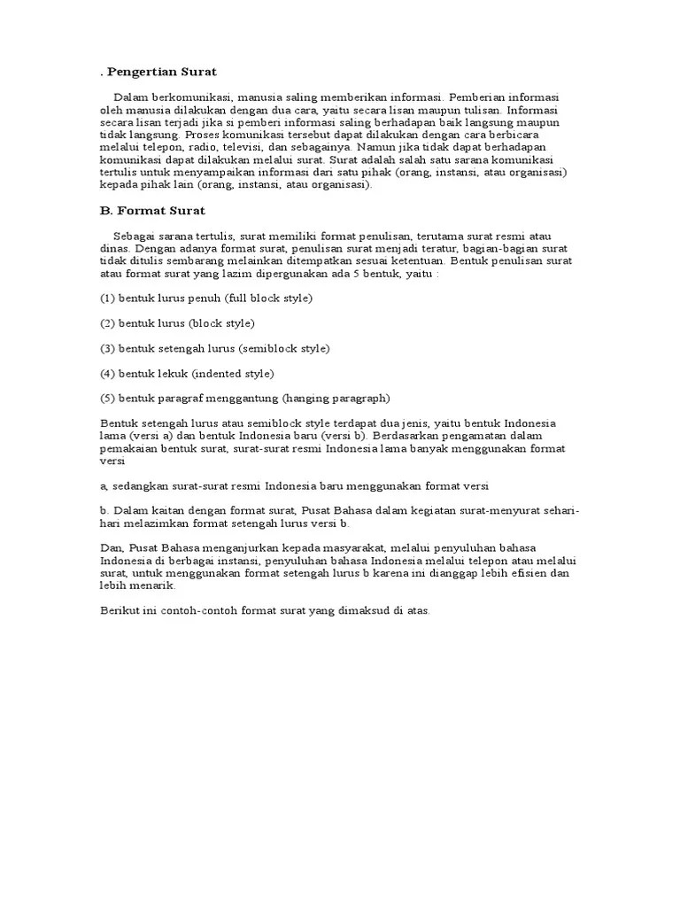 Bentuk surat setengah lurus (semi block style); Bentuk surat yang satu ini merupakan . Dimana pada surat bentuk setengah lurus ini pengetikan alamat suratnya sama dengan bentuk surat lurus sedangkan pengetikan isi suratnya sama dengan bentuk . Format surat bentuk lurus (block style). Bentuk setengah lurus (semi block style) merupakan bentuk surat dimana semua bagian surat, kecuali isi surat, diketika sama seperti bentuk lurus.